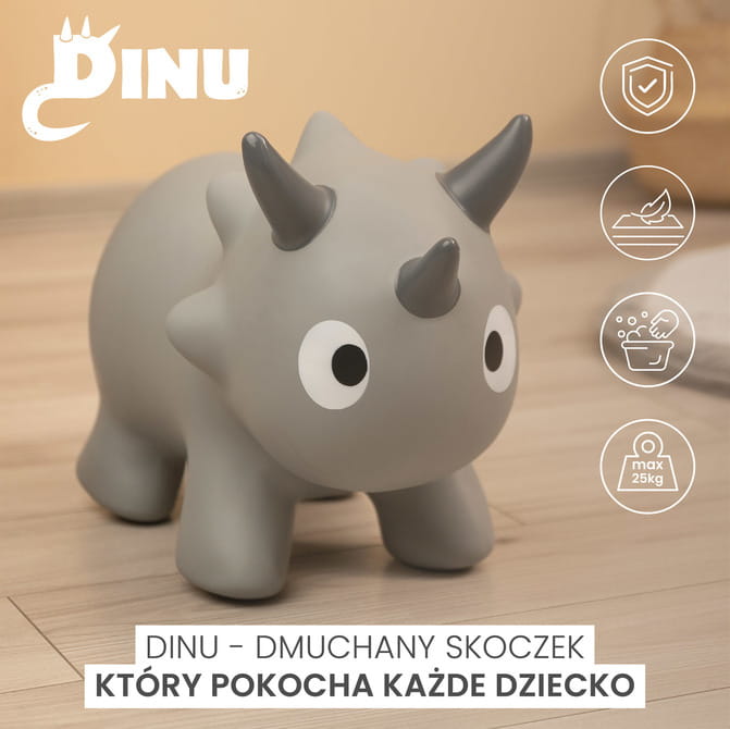 Γνωρίστε το Dinu - το φουσκωτό άλμα σε σχήμα χαριτωμένου τρικεράτοπα, που προσφέρει στα μικρά παιδιά ατελείωτη χαρά και κίνηση. Το Dinu είναι ο τέλειος τρόπος για ενεργό παιχνίδι και υποστήριξη της ανάπτυξης της κινητικής συντονισμού των μικρότερων παιδιών.