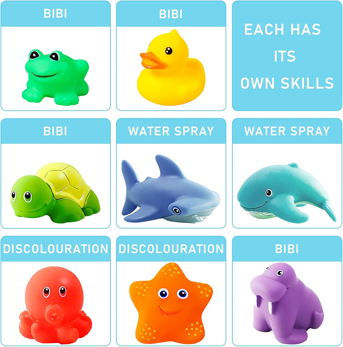 - Το παιχνίδι μπάνιου περιλαμβάνει: 1 x κίτρινη πάπια, 1 x φάλαινα, 1 x καρχαρίας, 1 x χελώνα, 1 x χταπόδι, 1 x φώκια, 1 x αστερίας και 1 x βάτραχος.