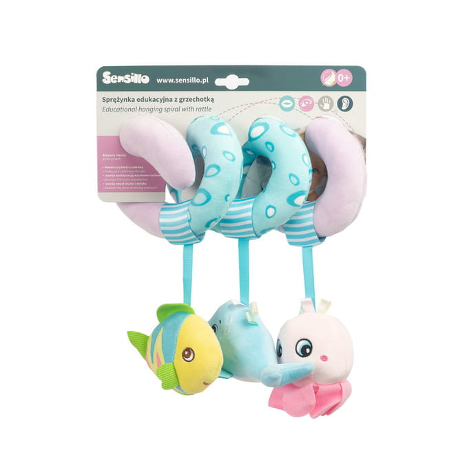 Το ελατήριο διαθέτει κρεμαστά αισθητηριακά παιχνίδια, όπως κουδουνίστρες και μασητικά, που αναπτύσσουν τις αισθήσεις του μωρού. Οι διαφορετικές υφές των υλικών διεγείρουν την αφή, ενώ τα έντονα χρώματα τραβούν την προσοχή του παιδιού, υποστηρίζοντας την οπτική και κινητική του ανάπτυξη.