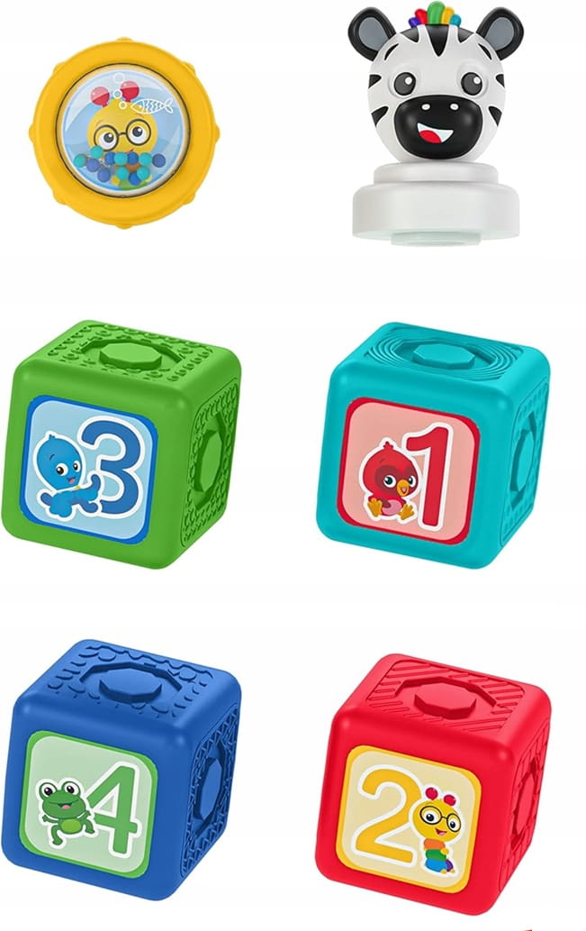 - Κάθε στοιχείο του σετ αναπτύσσει τις γνωστικές δεξιότητες των παιδιών: χάντρες και κουδουνίστρα, χρώματα, σχήματα και αριθμούς.