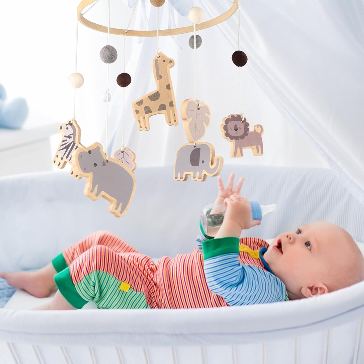 - Μοναδικός και μινιμαλιστικός σχεδιασμός: οι τσόχινες μπάλες είναι υψηλής ποιότητας και δεν μπερδεύονται μεταξύ τους. Παρέχουν οπτική διέγερση στα βρέφη με βάθος. Το φυσικό, καταπραϋντικό χρώμα προσφέρει αρκετό ενδιαφέρον στα νεογέννητα, χωρίς να τα υπερδιεγείρει. Ταυτόχρονα, τα φωτεινά χρώματα μπορούν να διεγείρουν οπτικά το μωρό και να ξυπνήσουν την περιέργειά του, αναπτύσσοντας την οπτική του ικανότητα να διακρίνει τα χρώματα.