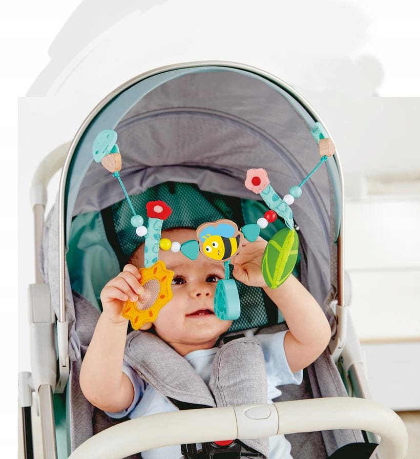 - Αλυσίδα για παιδικό καρότσι με ζωηρά χρώματα, διαφορετικές υφές και χαριτωμένες φιγούρες που προσκαλούν το παιδί να πιάσει και να κουνήσει.