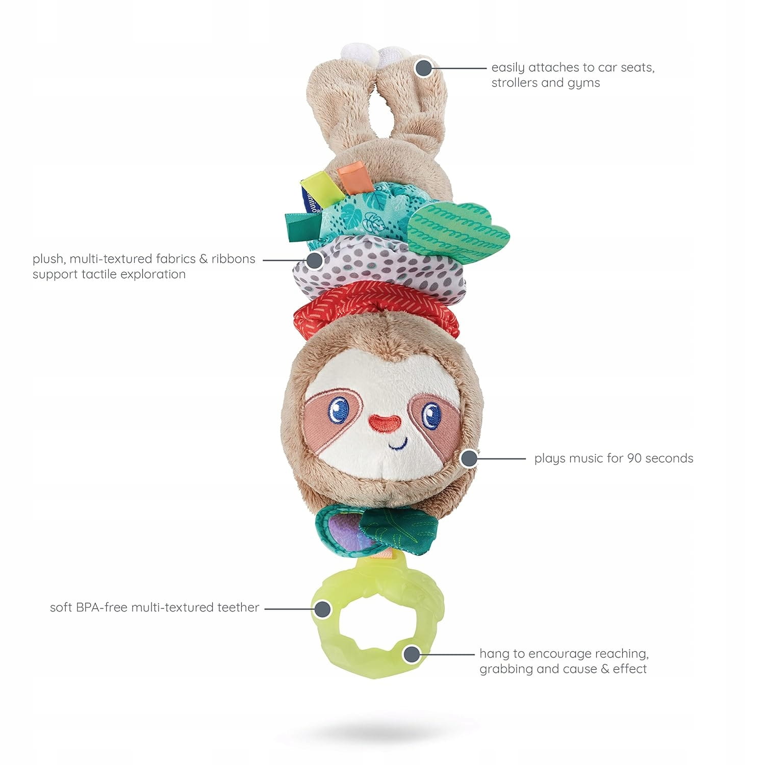 - Λούτρινο βραδύποδα για αγκαλιές και μουσική: Σχεδιασμένο με πλούσια υφάσματα πολλαπλών υφών, πολύχρωμες κορδέλες και 60 δευτερόλεπτα μουσικής, για να απασχολεί τα μικρά χεράκια και μυαλά κατά την ανακάλυψη αισθητηριακού παιχνιδιού.