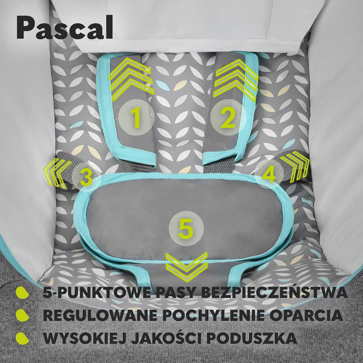 Με μία κίνηση, το Pascal μετατρέπεται από ρηλάξ σε άνετη ξαπλώστρα. Οι ιμάντες 5 σημείων φροντίζουν για την ασφάλεια του μωρού. Για ακόμα καλύτερη προσαρμογή στο μικρό χρήστη, στο προσκέφαλο υπάρχει επιπλέον μαξιλαράκι που σταθεροποιεί το κεφαλάκι. Η υψηλής ποιότητας, φιλική προς το δέρμα ταπετσαρία είναι κατάλληλη για πλύσιμο στο πλυντήριο.