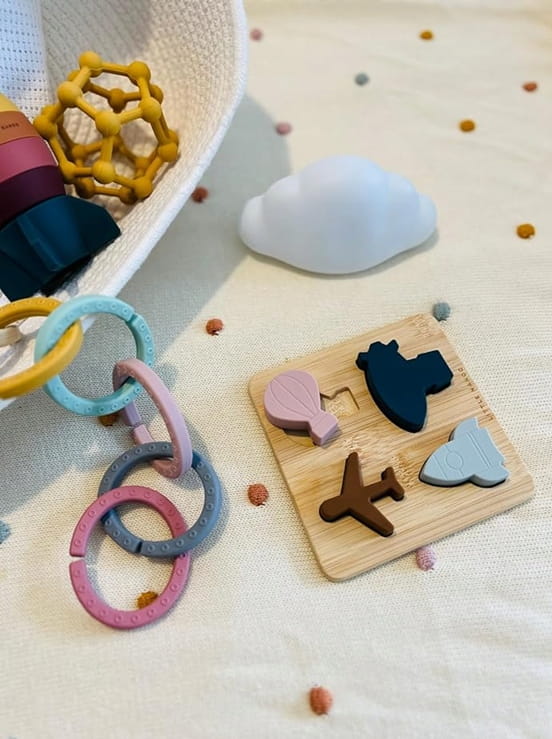 - 4 σιλικονούχα παζλ σε ξύλινη βάση.