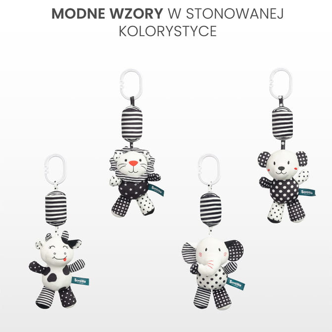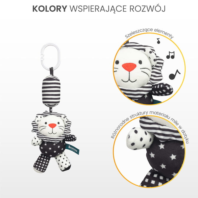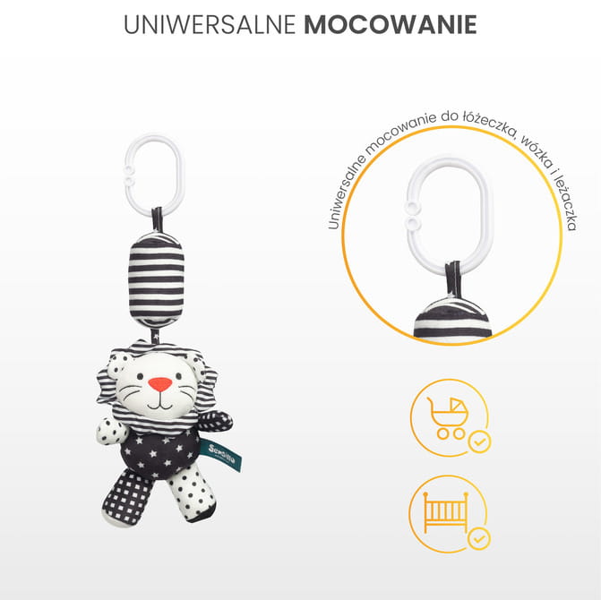 Η κρεμαστή κουδουνίστρα για καρότσι μωρού, που ξεχωρίζει με τα έντονα αντιθετικά χρώματα μαύρου και λευκού, έχει σχεδιαστεί για να διεγείρει την οπτική αντίληψη και την αισθητηριακή ανάπτυξη του μωρού. Ο απλός αλλά εξαιρετικά λειτουργικός σχεδιασμός της τραβάει την προσοχή του παιδιού, ενώ οι διαφορετικές υφές και σχήματα προσφέρουν διασκεδαστικό και ελκυστικό παιχνίδι.