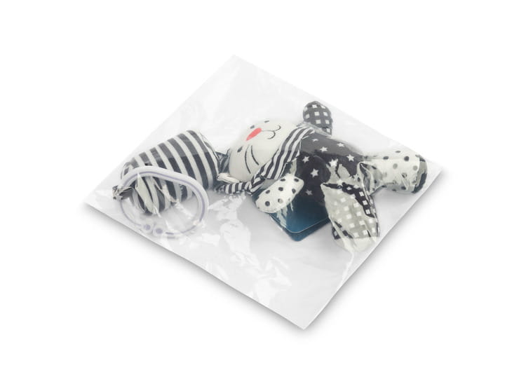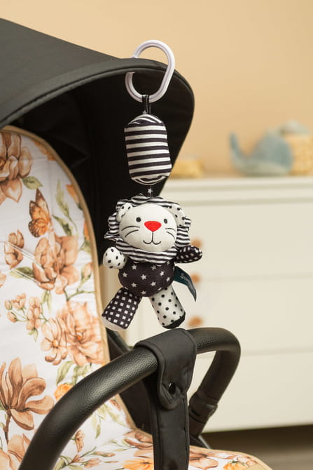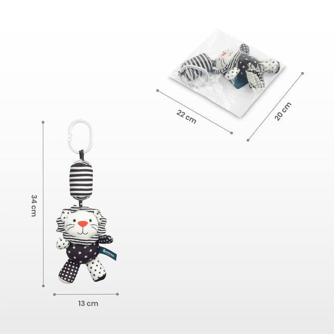 Η κρεμαστή κουδουνίστρα για καρότσι μωρού, που ξεχωρίζει με τα έντονα αντιθετικά χρώματα μαύρου και λευκού, έχει σχεδιαστεί για να διεγείρει την οπτική αντίληψη και την αισθητηριακή ανάπτυξη του μωρού. Ο απλός αλλά εξαιρετικά λειτουργικός σχεδιασμός της τραβάει την προσοχή του παιδιού, ενώ οι διαφορετικές υφές και σχήματα προσφέρουν διασκεδαστικό και δημιουργικό παιχνίδι.