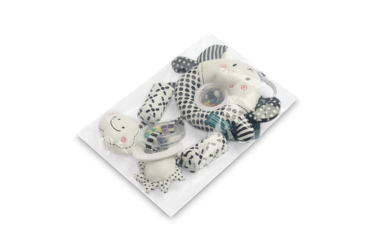Το παιχνίδι είναι κατασκευασμένο από μαλακά, ευχάριστα στην αφή υλικά σε έντονες αντιθέσεις χρωμάτων, που ενθαρρύνουν το μωρό να παίξει με τα συνοδευτικά αισθητηριακά κρεμαστά.