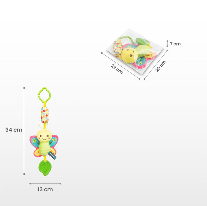 Ζωντανά χρώματα και έντονα μοτίβα τραβούν το βλέμμα του μωρού, διεγείροντας την περιέργειά του και βοηθώντας στην ανάπτυξη της οπτικής του αντίληψης. Το μαλακό ύφασμα, το μασητικό σε σχήμα φύλλου και το κουδουνιστό γέμισμα ενθαρρύνουν το πιάσιμο, το κούνημα και την ανακάλυψη νέων υφών.