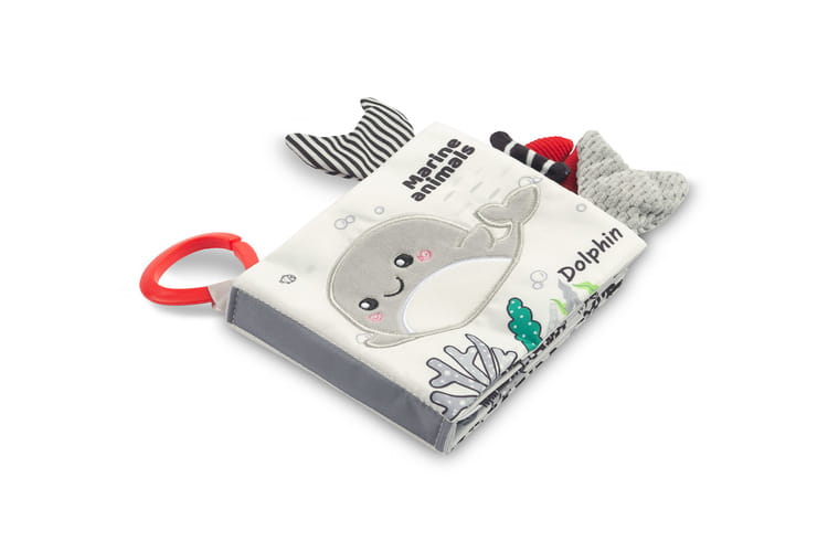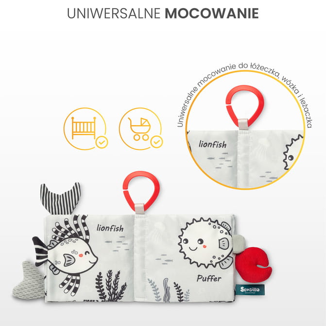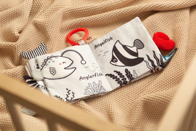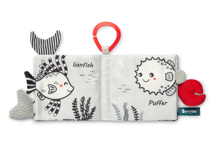 Το αισθητηριακό βιβλιαράκι σε ασπρόμαυρους χρωματισμούς είναι ένα μοναδικό παιχνίδι σχεδιασμένο για τη διέγερση των αισθήσεων του παιδιού. Συνδυάζει εικονογραφήσεις με διάφορες υφές και ήχους, προσφέροντας στα βρέφη πλούσιες αισθητηριακές εμπειρίες. Η απλή αλλά συναρπαστική παλέτα χρωμάτων σε αποχρώσεις του μαύρου και του λευκού διεγείρει αποτελεσματικά την όραση των μικρών παιδιών. Κάθε σελίδα του βιβλίου περιέχει διαφορετικές υφές υλικού και στοιχεία που σφυρίζουν ή τρίζουν. Χάρη στη χρήση ασφαλών υλικών και μαλακών σελίδων, το βιβλιαράκι είναι ιδανικό τόσο για το σπίτι όσο και για το ταξίδι.