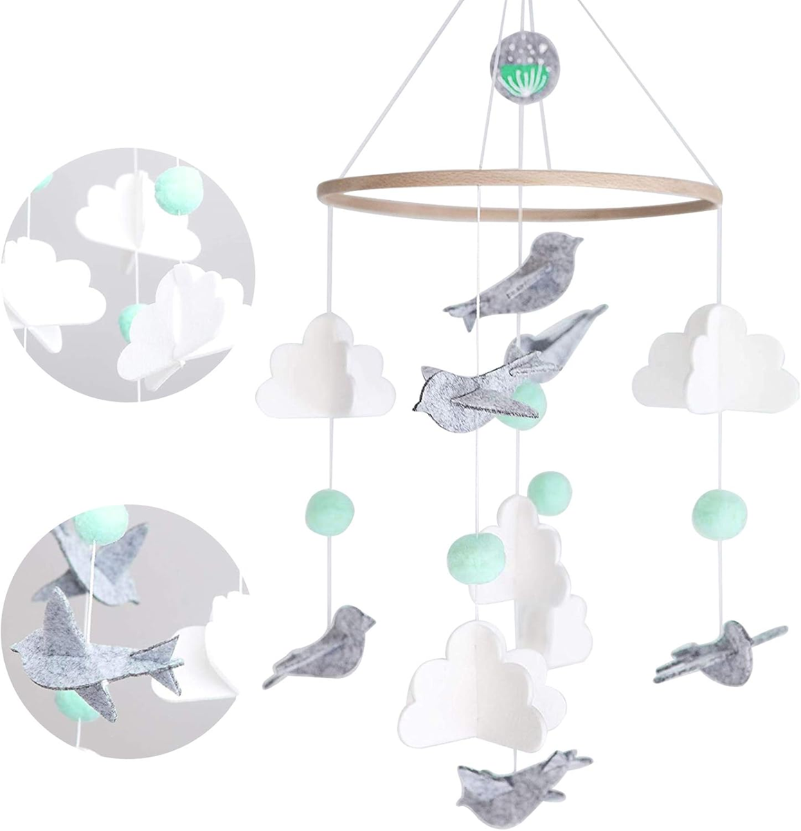 - Φυσικά υλικά: το κινητό καρουζέλ για κούνια μωρού είναι κατασκευασμένο από φιλική προς το περιβάλλον τσόχα και πλεκτές χάντρες, υψηλής ποιότητας ξύλινες χάντρες, ξύλινο κρεμαστό, μη τοξικό, φιλικό προς το περιβάλλον, ασφαλές, μπορεί να χρησιμοποιηθεί χωρίς ανησυχία, κατασκευασμένο από ακατέργαστο φυσικό μπαμπού, είναι πολύ ελαφρύ και μπορεί να κρεμαστεί στην κούνια ή σε άλλα σημεία.