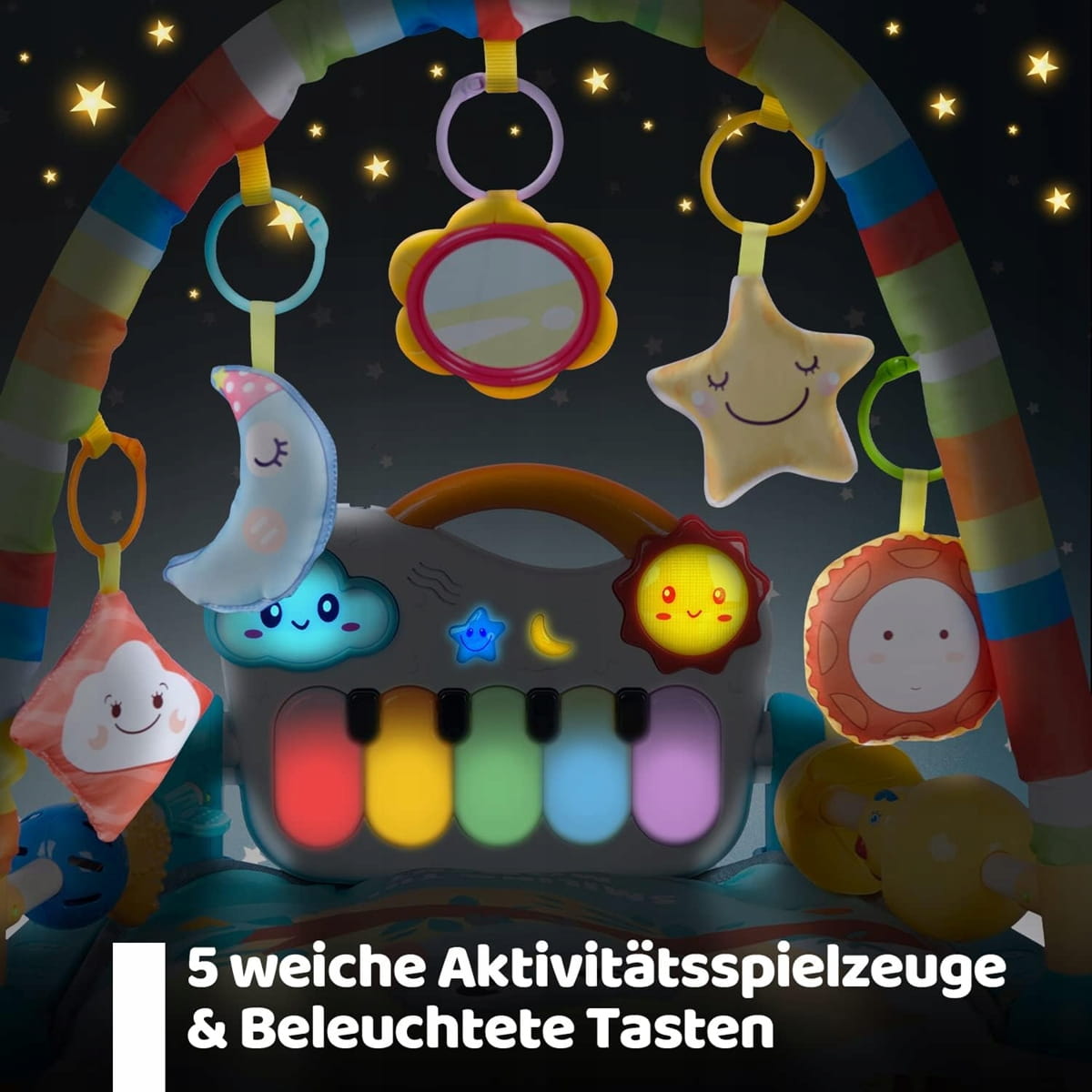 - Πλήρες σετ αξεσουάρ: Το γυμναστήριο για βρέφη περιλαμβάνει πιάνo αφής και μαλακό χαλί, 5 αποσπώμενες πολύχρωμες κουδουνίστρες και 4 υφασμάτινα παιχνίδια με μικρό καθρέφτη. Πάνω από 50 μελωδίες και 8 φώτα LED (συμπεριλαμβανομένου φωτός προβολής και κλιμάκων) προσφέρουν ατελείωτη διασκέδαση για παιδιά στην αντίστοιχη ηλικιακή ομάδα.